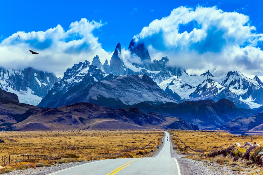 Summer day in Patagonia. Fine highway to the grandiose Mount Fitz Roy. The concept of active and extreme tourism. The Andean condors hover over the prairie